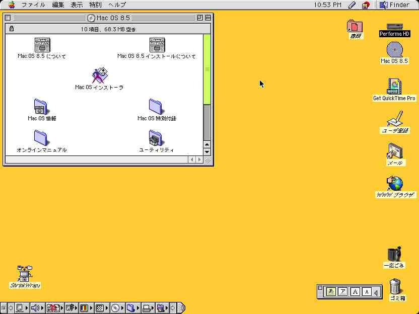 無事インストールが始ってT・I氏(34)は余裕でシャワーを浴びに行くなど、気を抜いてMacの前から離れていたら、知らないうちにインストール中にもう一度OKボタンを押すという事態に巻き込まれ、Macの前に戻るとまだ、ほとんどインストールされておらず、OKボタンを押すと再度インストールが始まり、約25分後に再起動後、無事、MacOS8.5が動きだしT・I氏(34)の目的は無事達成された模様です。